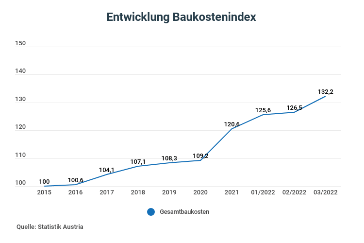 Der Baukostenindex dient als Orientierungshilfe für die Kostenentwicklung von Material und Arbeit bei Bauvorhaben. 2015 wurde der Index mit dem Basiswert 100 neu definiert. Seit 2015 stieg der Baukostenindex weiter an, besonders vom Jahr 2016 auf 2018 gab es einen sprunghaften Anstieg.