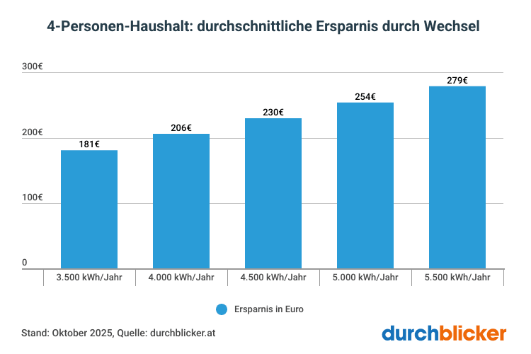 Bei einem Verbrauch von 5.000 Kilowattstunden haben Vier-Personen-Haushalte durch den Stromanbieterwechsel über durchblicker.at durchschnittlich 254 Euro gespart.