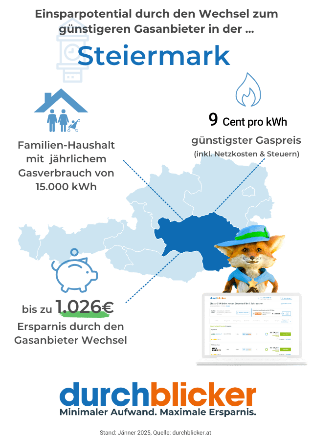 Der günstigste Gaspreis pro kWh liegt in der Steiermark bei rund 9 Cent (inkl. Netzkosten & Steuern). Mit dem Wechsel zum günstigen Tarif können bis zu 1.026€ gespart werden!