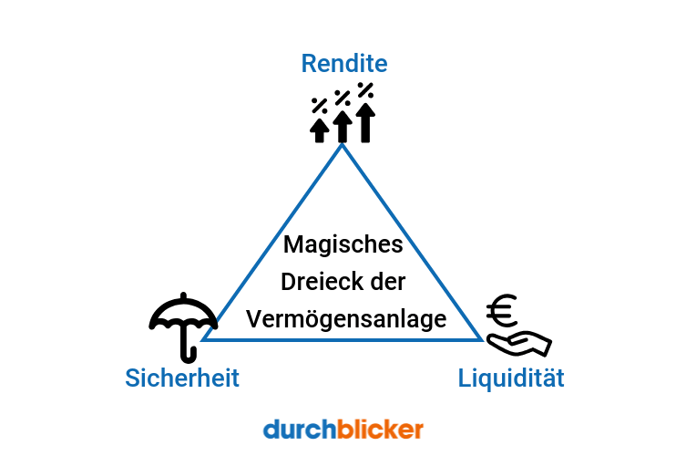 Die ideale Geldanlage hätte eine äußerst hohe Rendite, das angelegte Kapital wäre flexibel verfügbar und die Anlage wäre besonders sicher, ohne wenig Risiko. In der Realität ist es aber sehr schwer eine Anlage zu finden, die auch tatsächlich all diese Ziele gleichermaßen erfüllt. Man spricht in diesem Zusammenhang auch vom magischen Dreieck der Vermögensanlage, welches die konkurrierenden Ziele beim Investieren beschreibt: