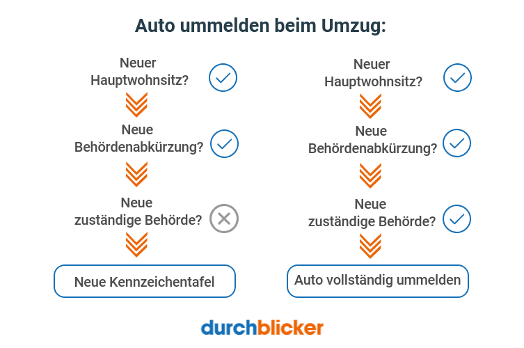 Wird durch den Umzug und Ihren neuen Hauptwohnsitz eine andere Zulassungsbehörde zuständig und das Behördenkennzeichen verändert sich, dann muss eine Abmeldung und eine neue Anmeldung des Kfz erfolgen. Sowohl Abmeldung als auch Anmeldung des Fahrzeugs sind bei einer Zulassungsstelle im Bezirk des neuen Hauptwohnsitzes durchzuführen.