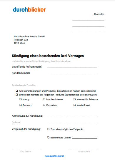 Ja, die Kündigung Ihres Drei Vertrags muss schriftlich erfolgen. Wichtig ist auch, dass die Kündigung vom Vertragsnehmer bzw. der Vertragsnehmerin unterschrieben wird. Auf der Kündigungsvorlage ist auch ein Vermerk angeführt, dass Drei Ihnen den Erhalt der Kündigung bestätig. Unser Tipp: fragen Sie ein paar Tage nach Versand des Kündigungsschreibens bei Ihrem Anbieter nach, ob dieser die Kündigung auch erhalten hat (sofern sich Ihr Anbieter nicht bereits selbständig bei Ihnen gemeldet hat).
