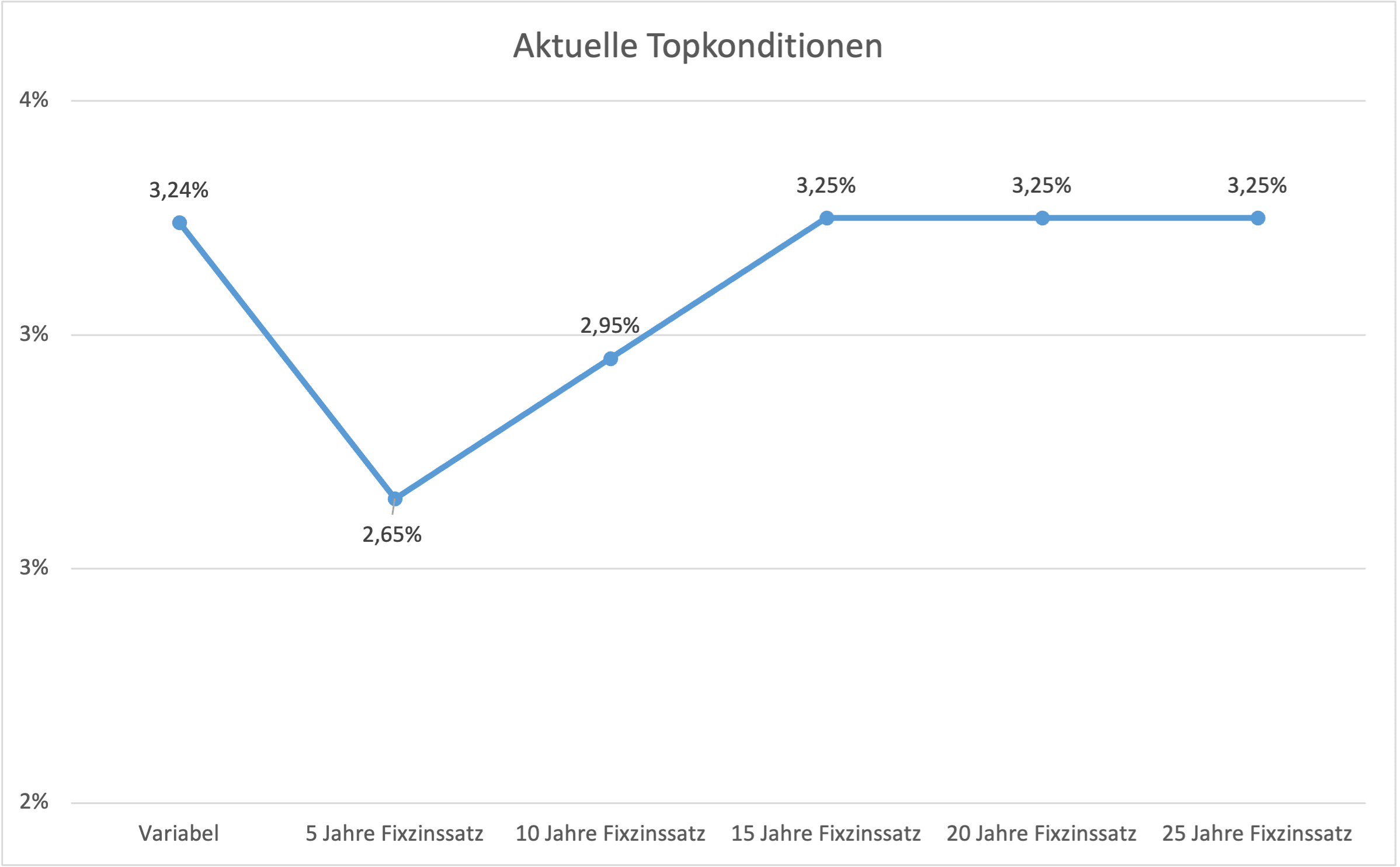 Fix verzinste Kredite sind variablen in den meisten Fällen weiterhin vorzuziehen. Aktuell liegen die besten Konditionen für einen variablen Kredit bei 3,24 % p. a., für einen fünfjährigen fix verzinsten Kredit bei 2,65 % p. a. und für einen zehnjährigen Fixzins bei 2,95 % p.a. Ab 15 Jahren Laufzeit zahlt man für einen fix verzinsten Kredit 3,25 % p.a.” Obwohl die variablen Zinssätze aktuell auf dem selben Niveau liegen wie langfristige Fixzinssätze, sollte das Zinsänderungsrisiko ausgeschaltet werden. Fixzinssätze stellen deshalb die sicherste Variante dar“, ergänzt Spona.