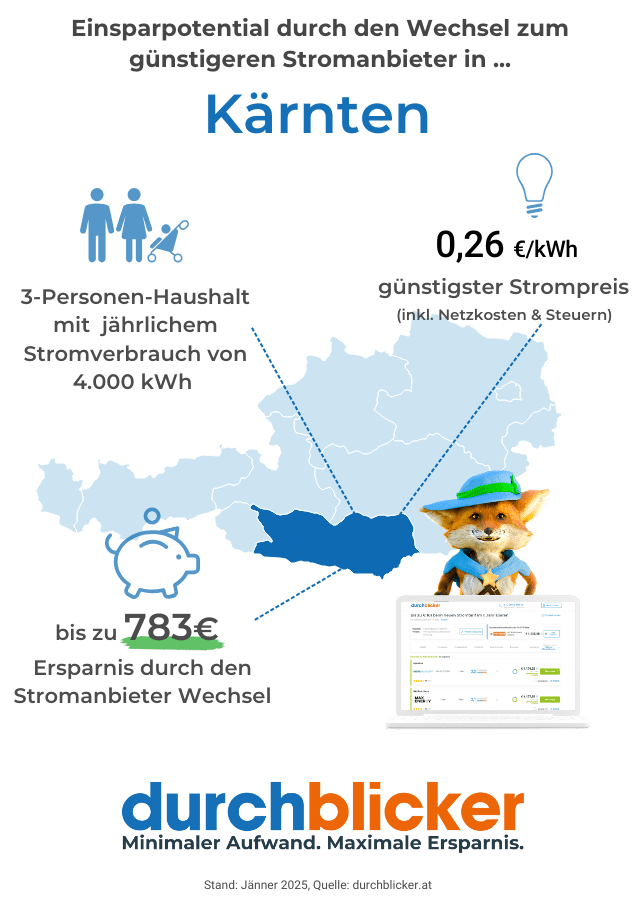 In Kärnten liegt der durchschnittliche Strompreis für einen jährlichen Verbrauch von 4.000kWh bei rund 35 Cent pro kWh (unter Berücksichtigung von Netzkosten und Steuern). Der aktuell günstigste Strompreis (inkl. Netzkosten und Steuern) liegt in Kärnten bei 26 Cent pro kWh – der Vergleich lohnt sich also in jedem Fall.