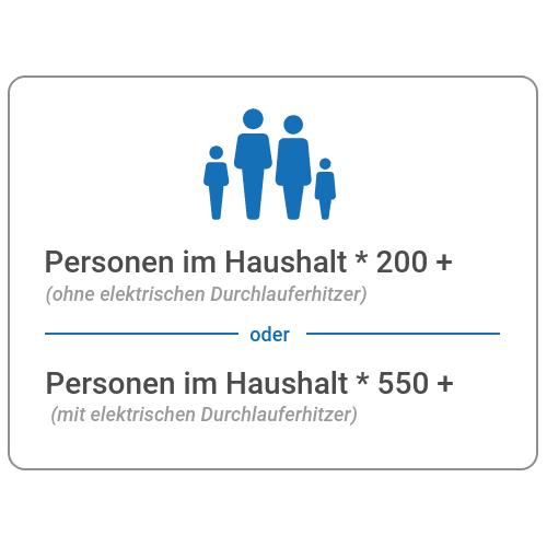 Multiplizieren Sie die Anzahl der im Haushalt lebenden Personen mit 200 oder mit 550, wenn Sie einen elektrischen Durchlauferhitzer für die Warmwasseraufbereitung verwenden.
