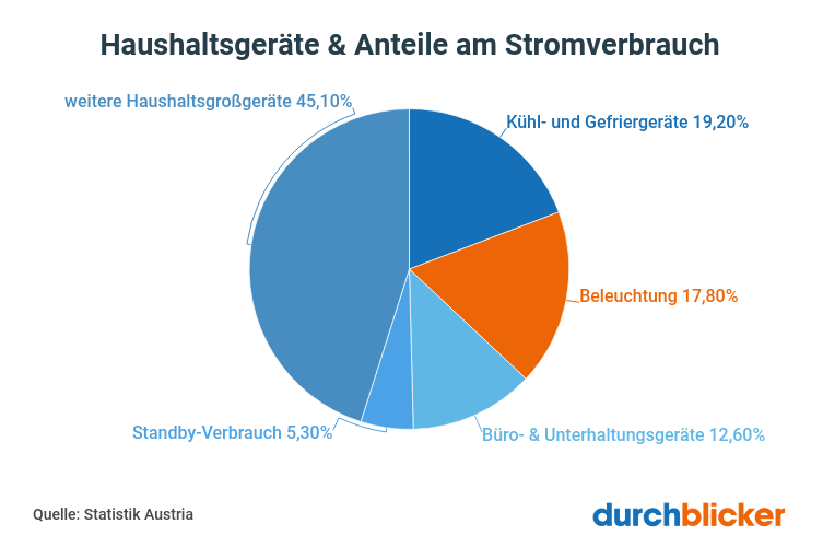 Die folgende Aufstellung der Statistik Austria zeigt, welche Arten von Elektrogeräten am meisten zum Stromverbrauch beitragen (hierbei wurde aber die Warmwasseraufbereitung und Heizung ausgeklammert).