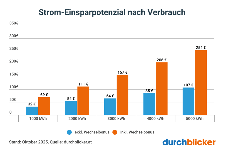 Durchschnittliche Ersparnis berechnet basierend auf dem Wechsel vom regionalen Anbieter zum günstigeren Alternativanbieter für die Region Wien, für den durchschnittlichen Stromverbrauch nach unterschiedlichen Haushaltsgrößen.