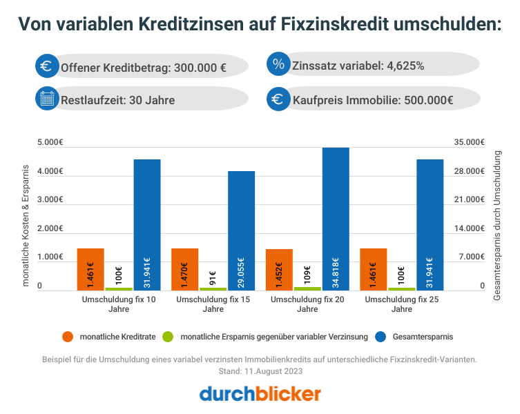Wenn Sie einen Kredit in Höhe von 300.000 Euro mit einem Zinssatz von 4,265% haben, können Sie sich aktuell bei einer Restlaufzeit von 30 Jahren bis zu 109 Euro monatlich sparen, wenn Sie auf einen 20 Jahre Fixzinskredit umschulden. So wechseln Sie von Ihrem aktuellen variablen Kredit auf einen Umschuldungskredit mit günstigerer und gegen Zinssteigerung abgesicherter fixe Kreditrate und sparen monatlich bares Geld. Über die gesamte Laufzeit hinweg gerechnet können Sie so rund 34.800€ einsparen!
