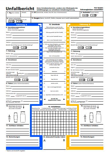 Ihr Unfallgegner hat denselben europäischen Unfallbericht, aber in einer anderen Sprache. Die Fragen und die Reihenfolge der Fragen sind ident. Die Nummerierung der einzelnen Punkte kann als Leitfaden für die Unfallberichte in unterschiedlicher Sprache herangezogen werden.