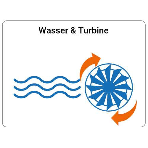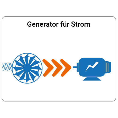 Die Bewegungsenergie der Turbine wird an einen Generator weitergeleitet. Im Generator sind Elektromagneten befestigt, welche um Kupferdrahtspulen rotieren – dadurch entsteht elektrischer Strom.